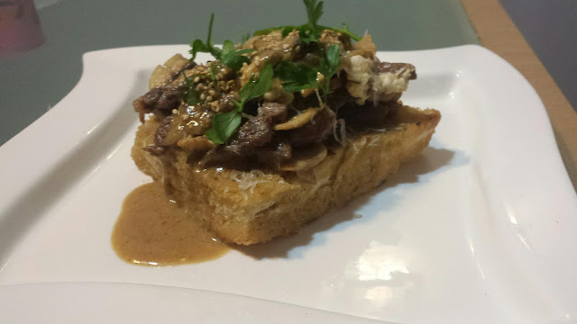 2 rebanadas de pan de hogaza gruesas tostadas.180gr de filetes de ternera de aguja.